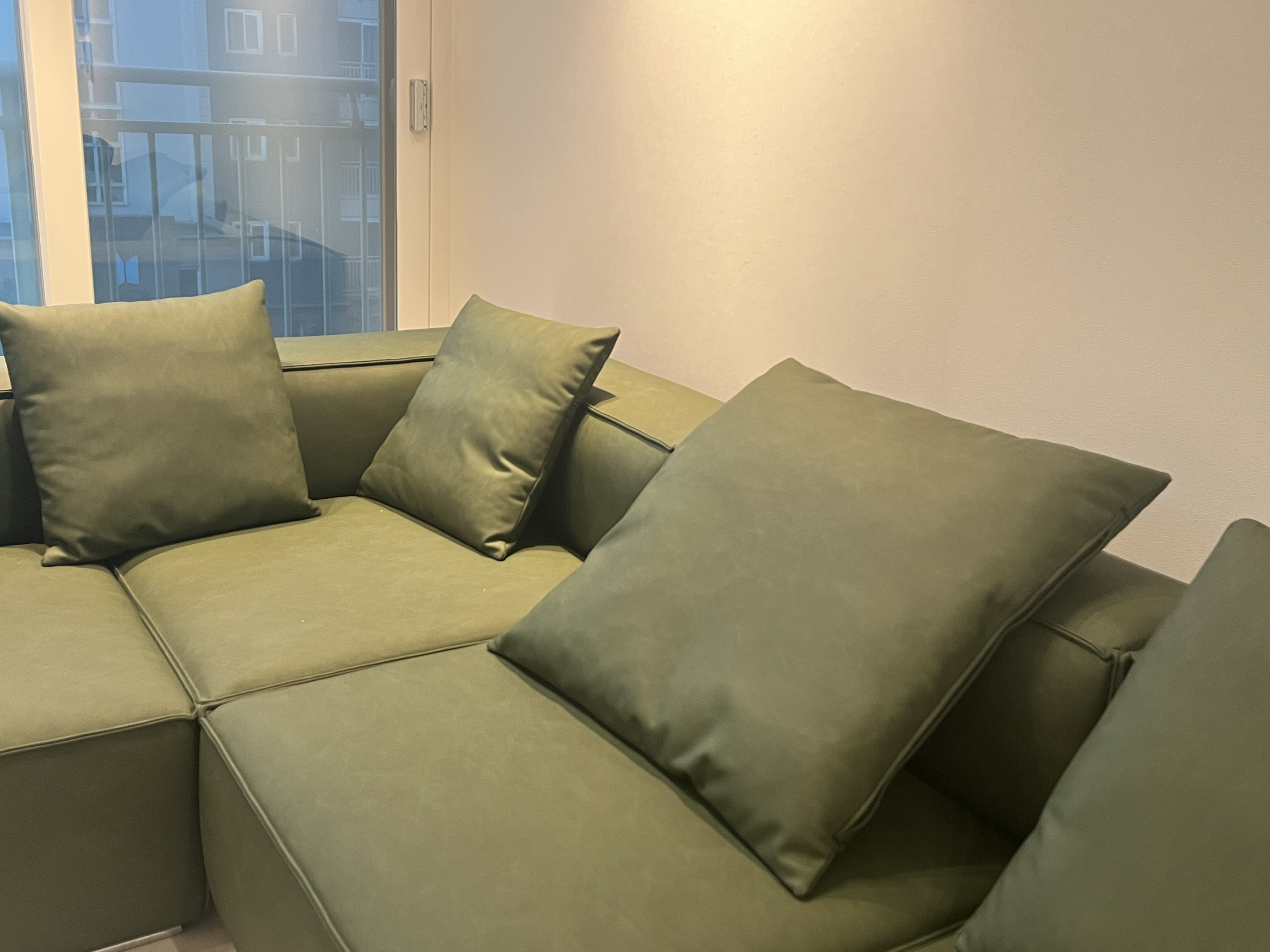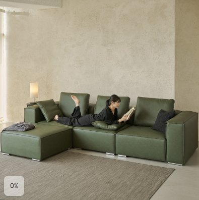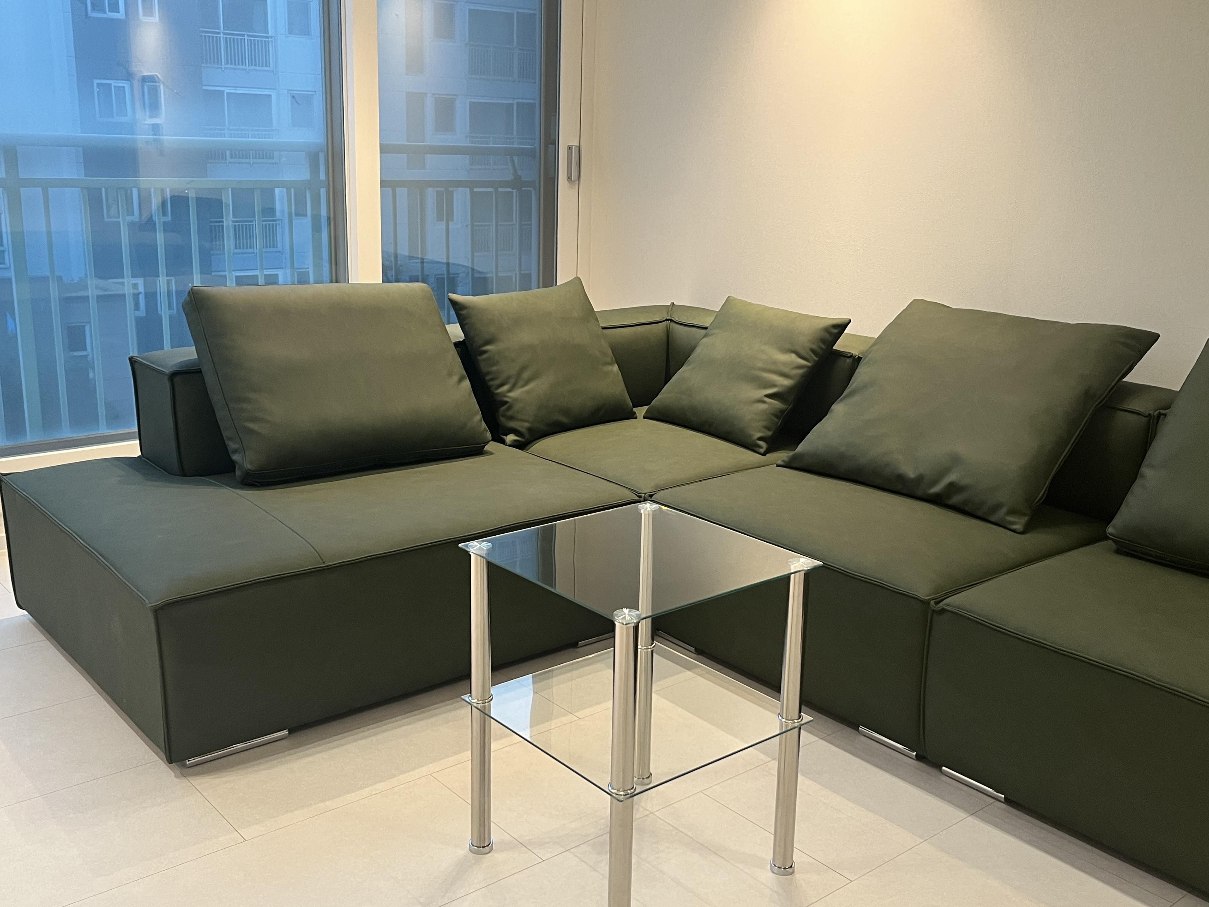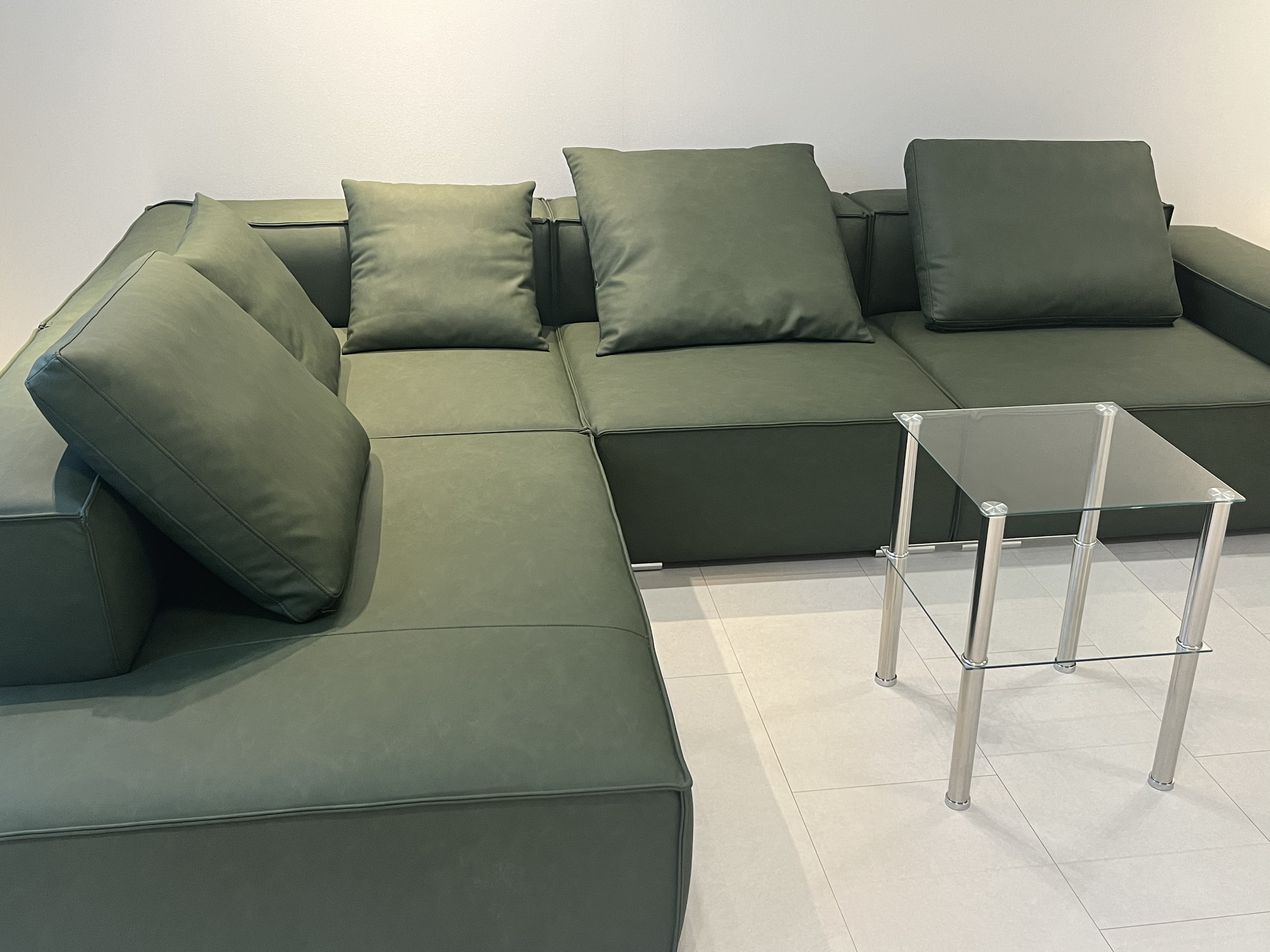 그러던 중 썸앤데코 매장에서 마주한 마론 비건 가죽 소파. 솔직히 말하면, 처음 봤을 때는 그냥 ‘어? 예쁘다’ 정도였는데 가까이에서 색감과 질감을 보고 나니 생각이 완전히 바뀌었다. 딱 내가 찾고 있던 초록빛 컬러였고, 너무 튀지 않으면서도 거실에 포인트가 되어줄 색감이었다. 흔한 색상이 아니라서 더 마음에 들었다.