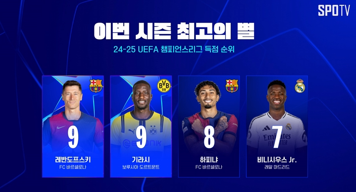 - 로베르트 레반도프스키 (바르셀로나) – 여전히 골 감각이 살아있는 베테랑 스트라이커. 챔스에서도 팀의 핵심 공격수로 활약 중.